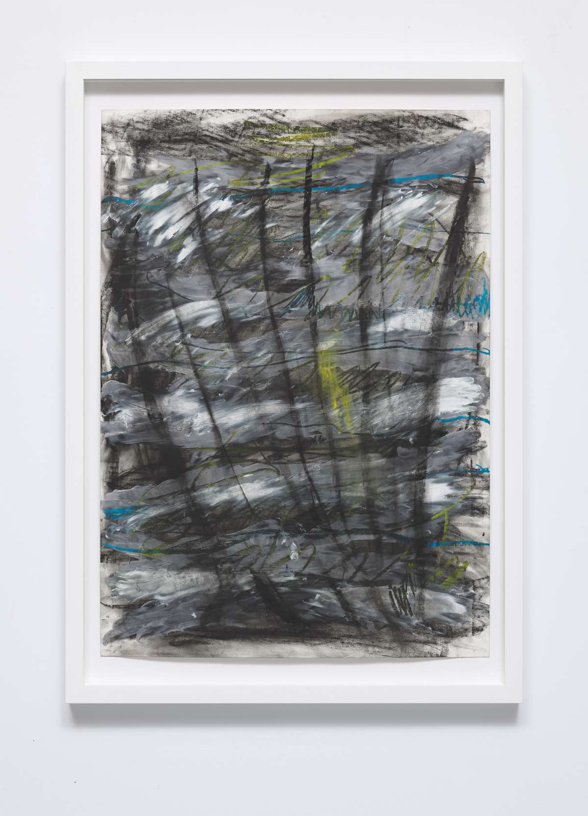 Charcoal, oil stick, motor oil & spray paint on raw canvas