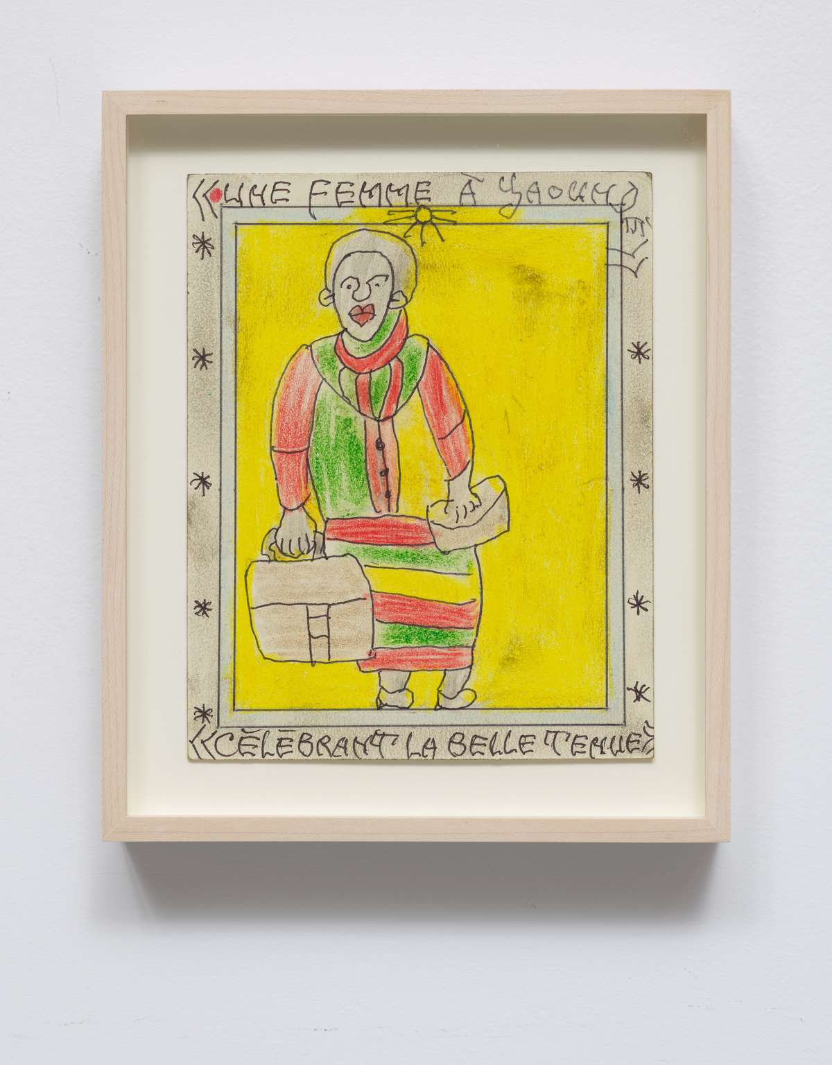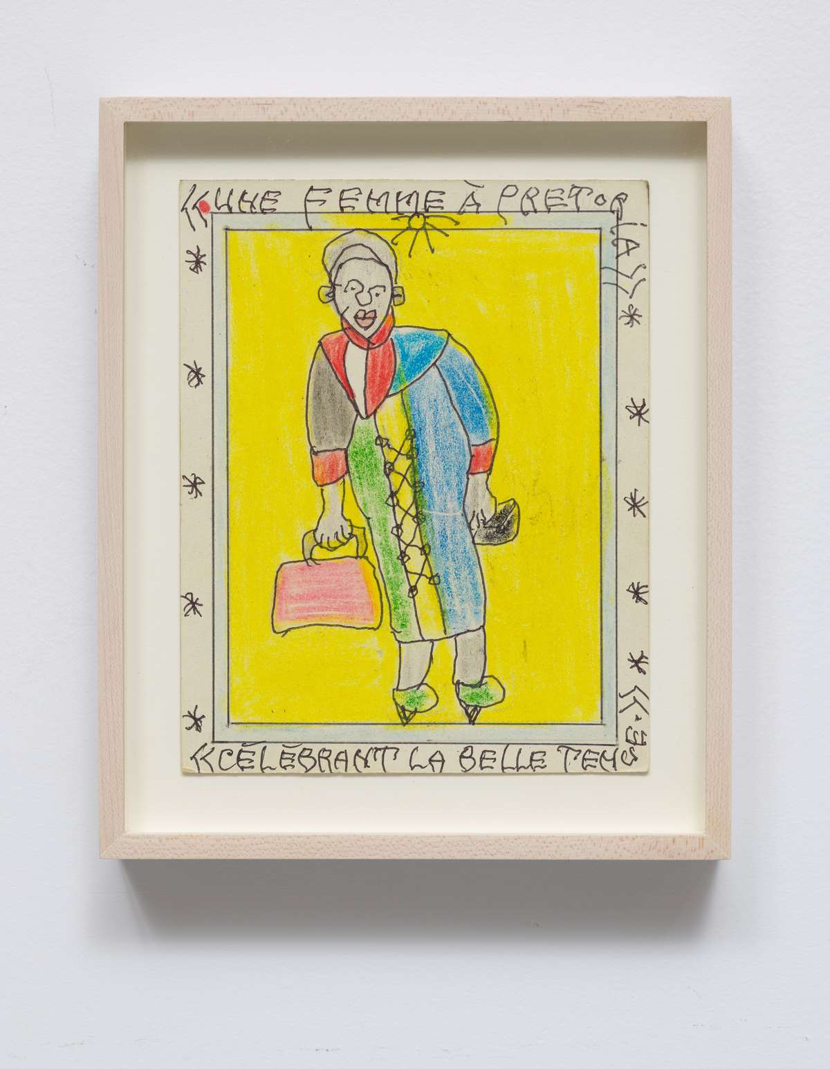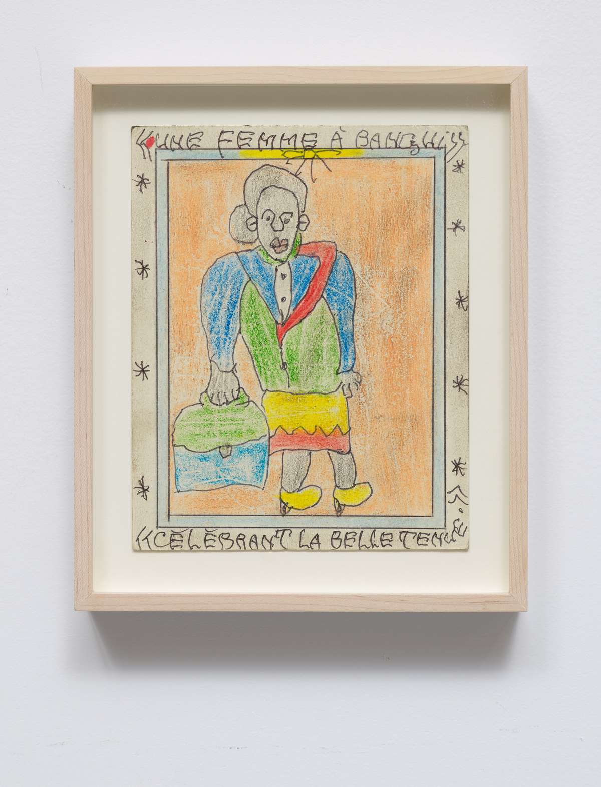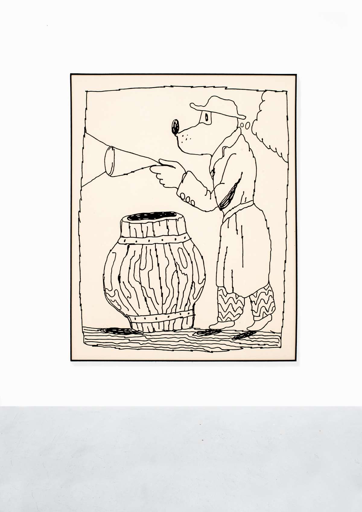India ink and collage on raw canvas, stretched found fabric on artist designed wooden stretcher
