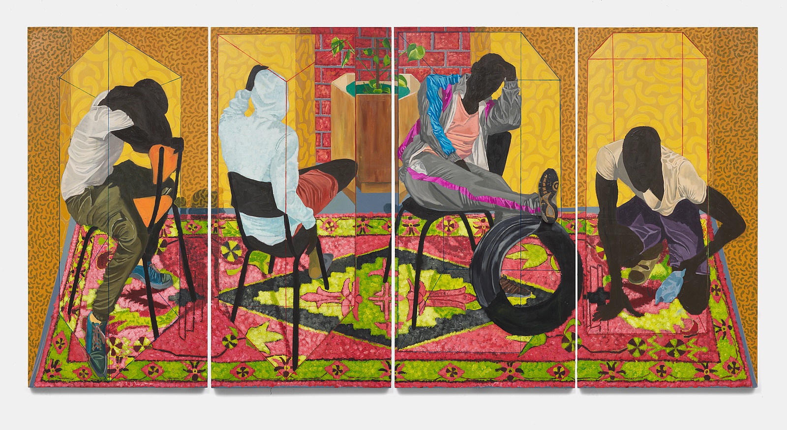 Gideon Appah Gentlemen (Diptych), 2019 Acrylic on canvas Each panel: 68 1/2 x 48 3/4 x 1 1/2 inch